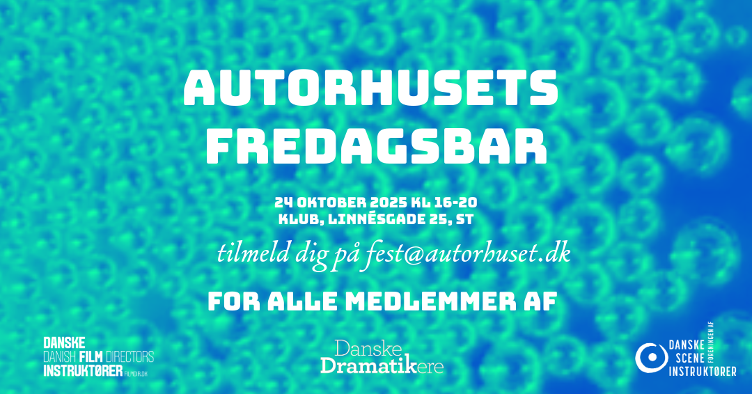Klub Linnésgade 25, stuen, København KInvitation til FREDAGSBAR for medlemmer af Danske Sceneinstruktører, Danske Dramatikere & Danske Filminstruktører 24 oktober 2025 kl 16-20 i KLUB, Linnésgade 25, stuen. Meld dig til på fest@autorhuset.dk. Vi glæder os til at se jer!